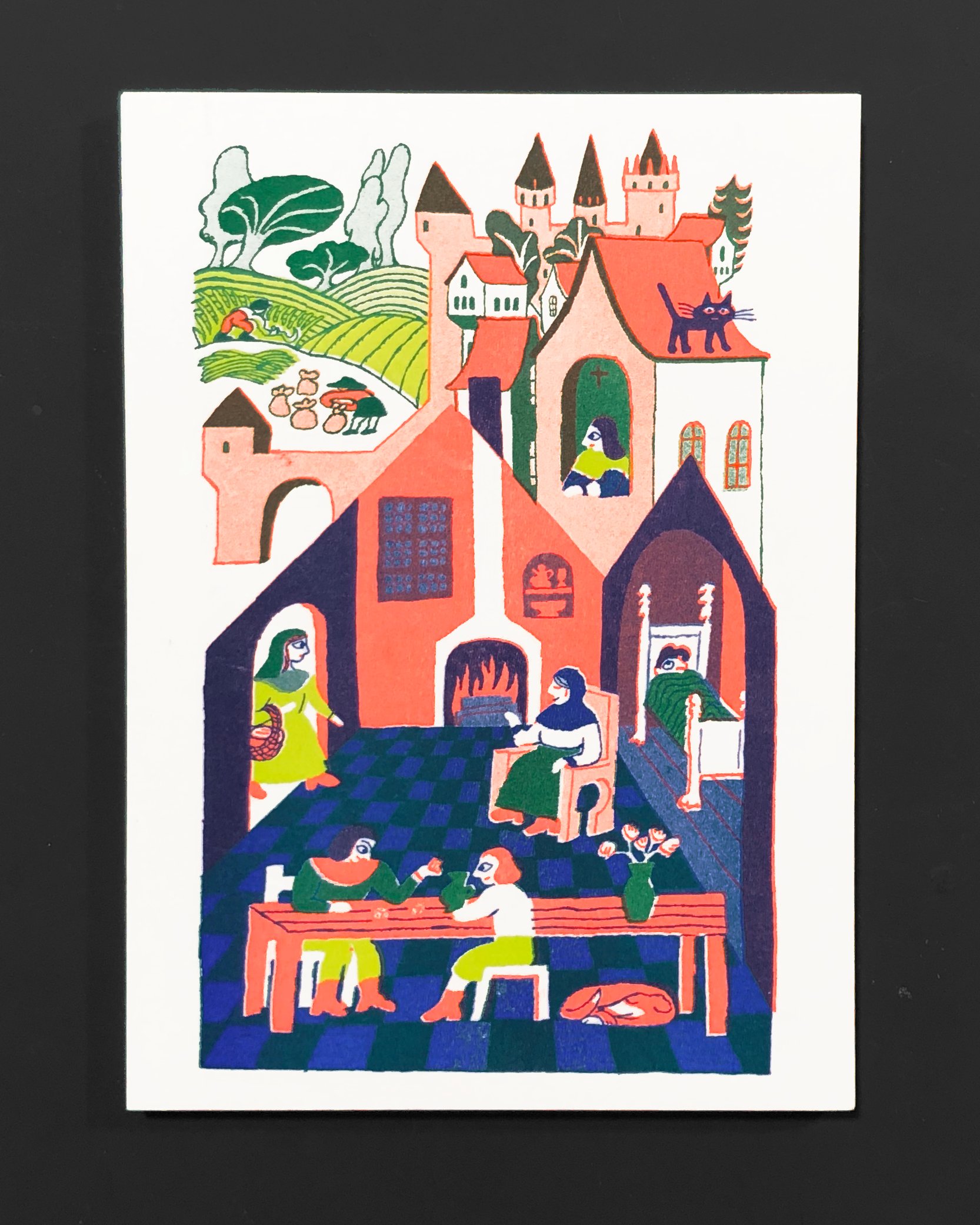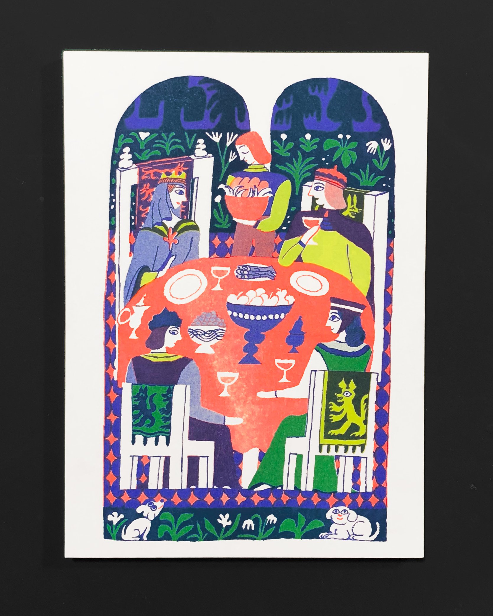 Impression riso quatre couleurs (bleu medium, orange fluo, vert, jaune citron) chez Studio Fidèle (Paris) sur du papier Metapaper 270 g/m.
